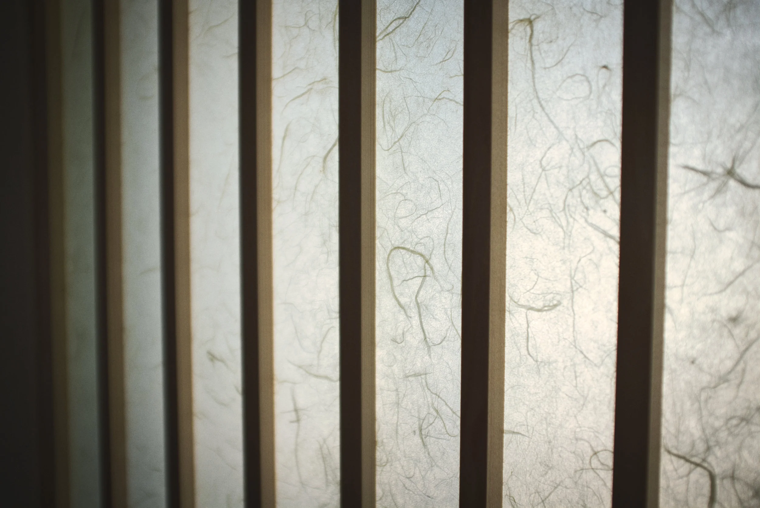 Sliding shoji doors backed by natural indigo chambray cloth.