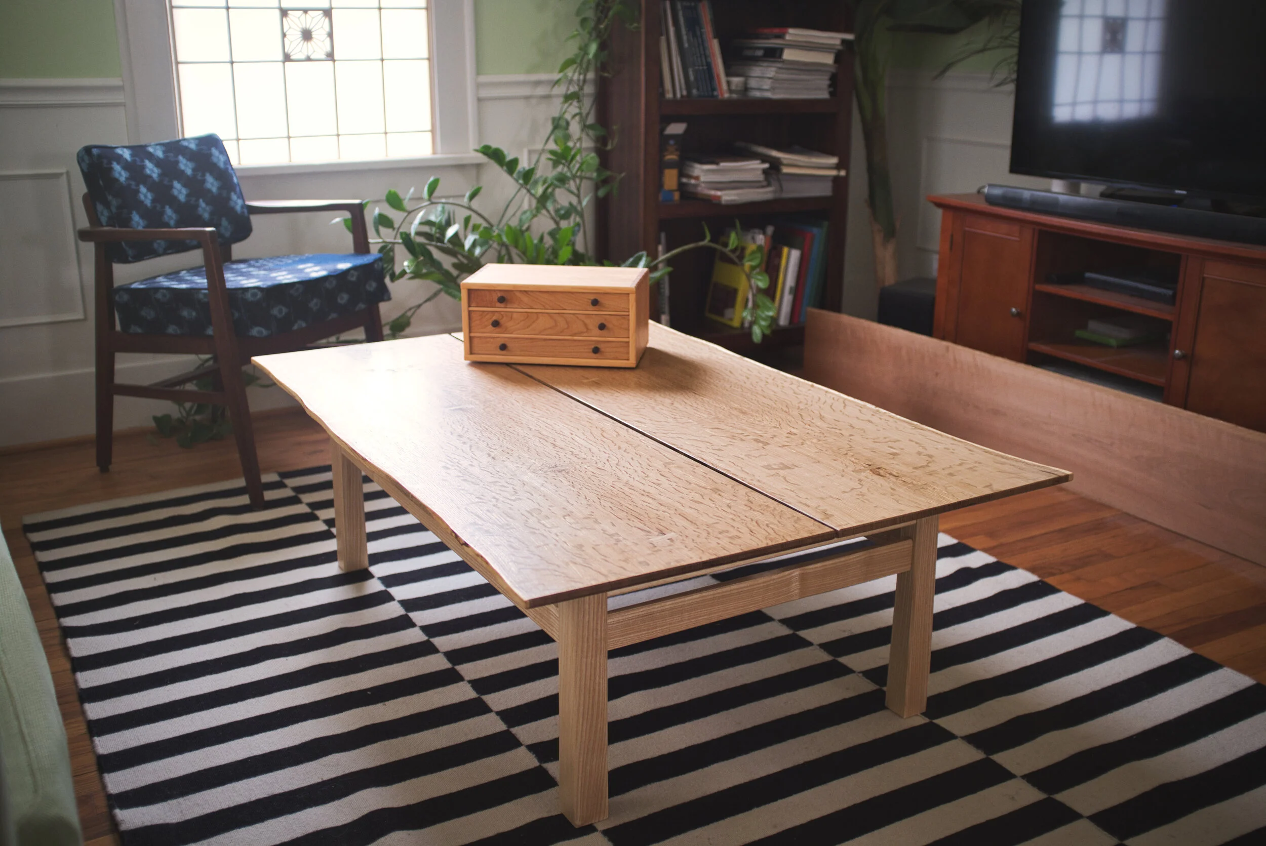 Table made from a quarter sawn white oak, and oiled ash. Incense box made from waxed Douglas fir, and oiled cherry.