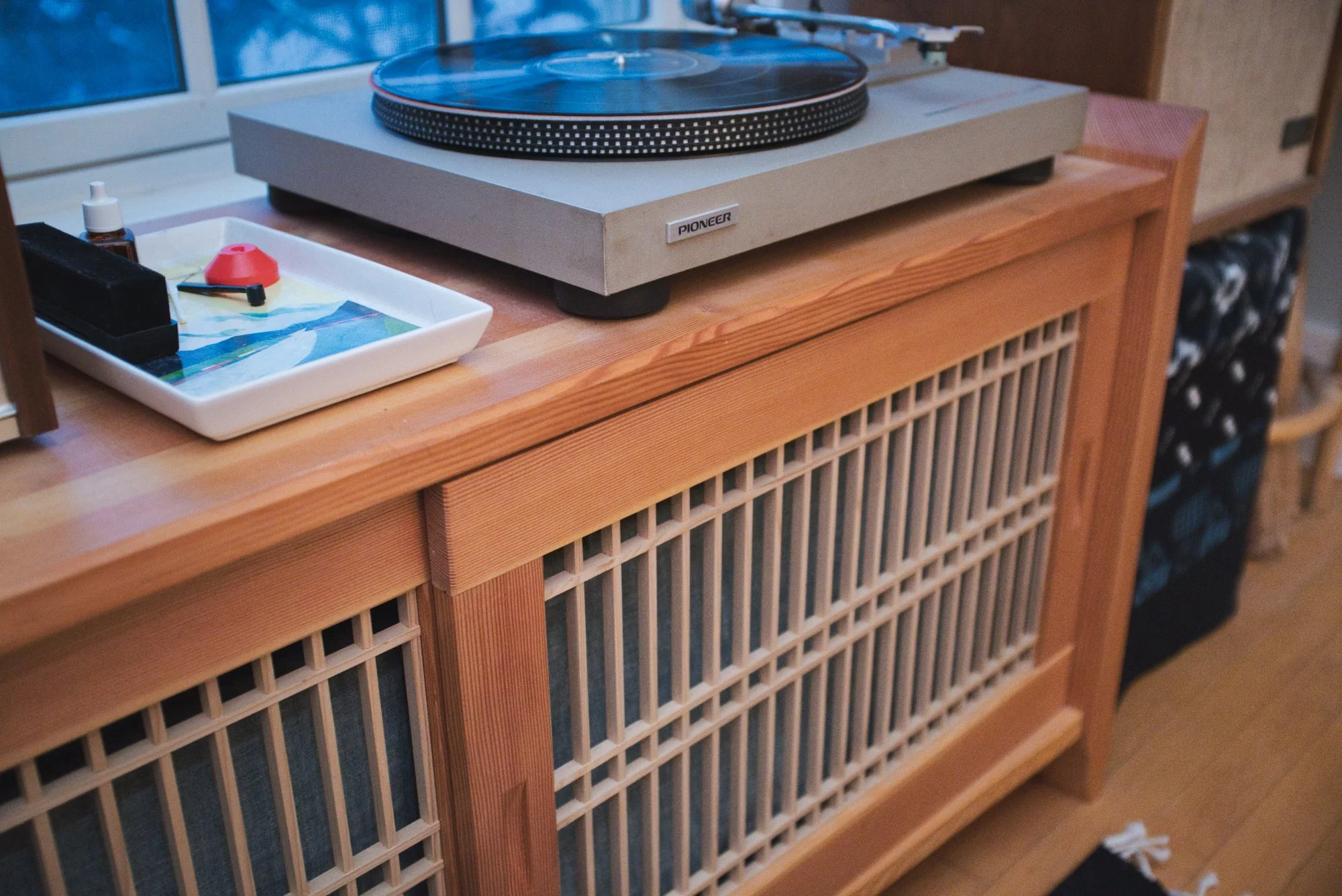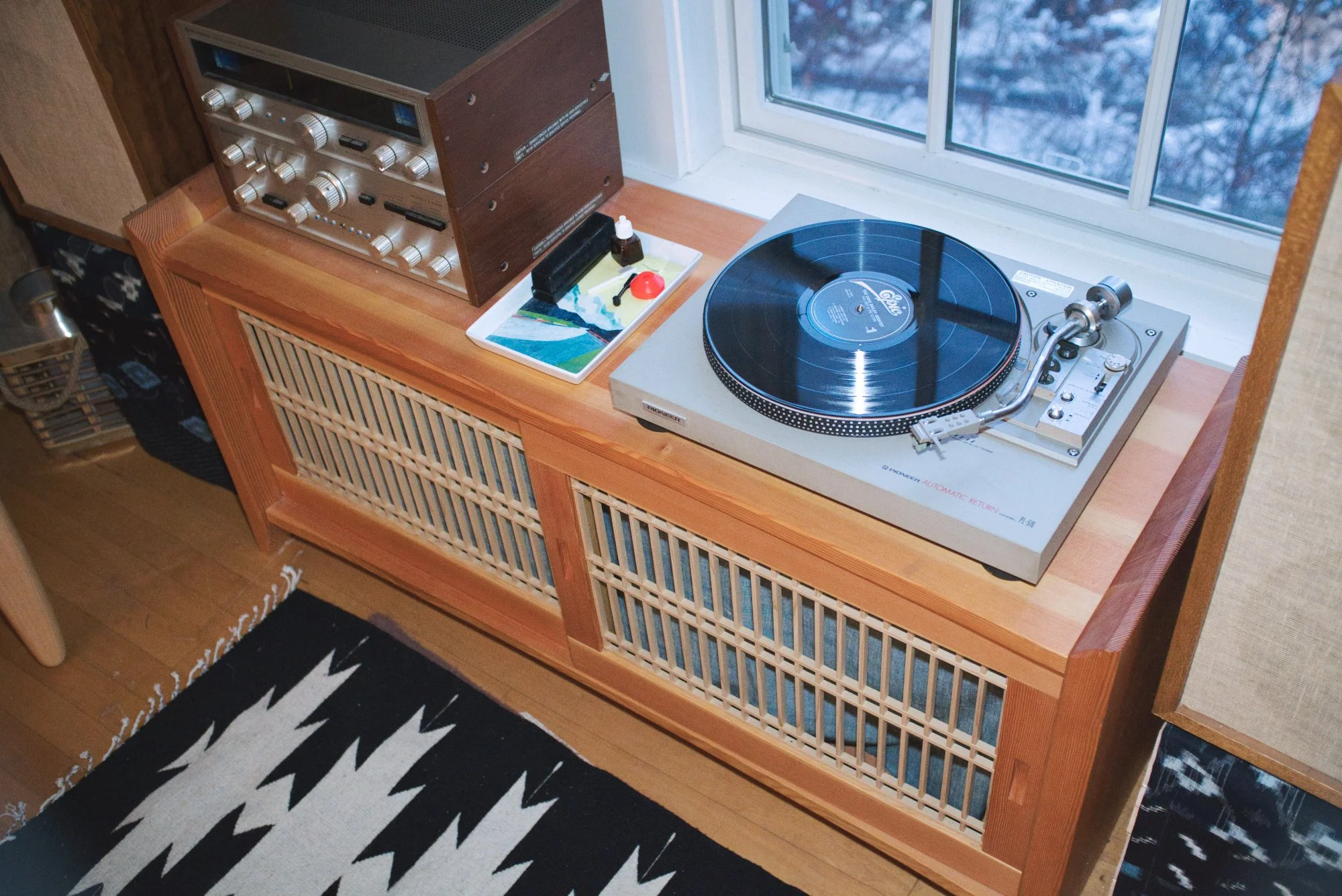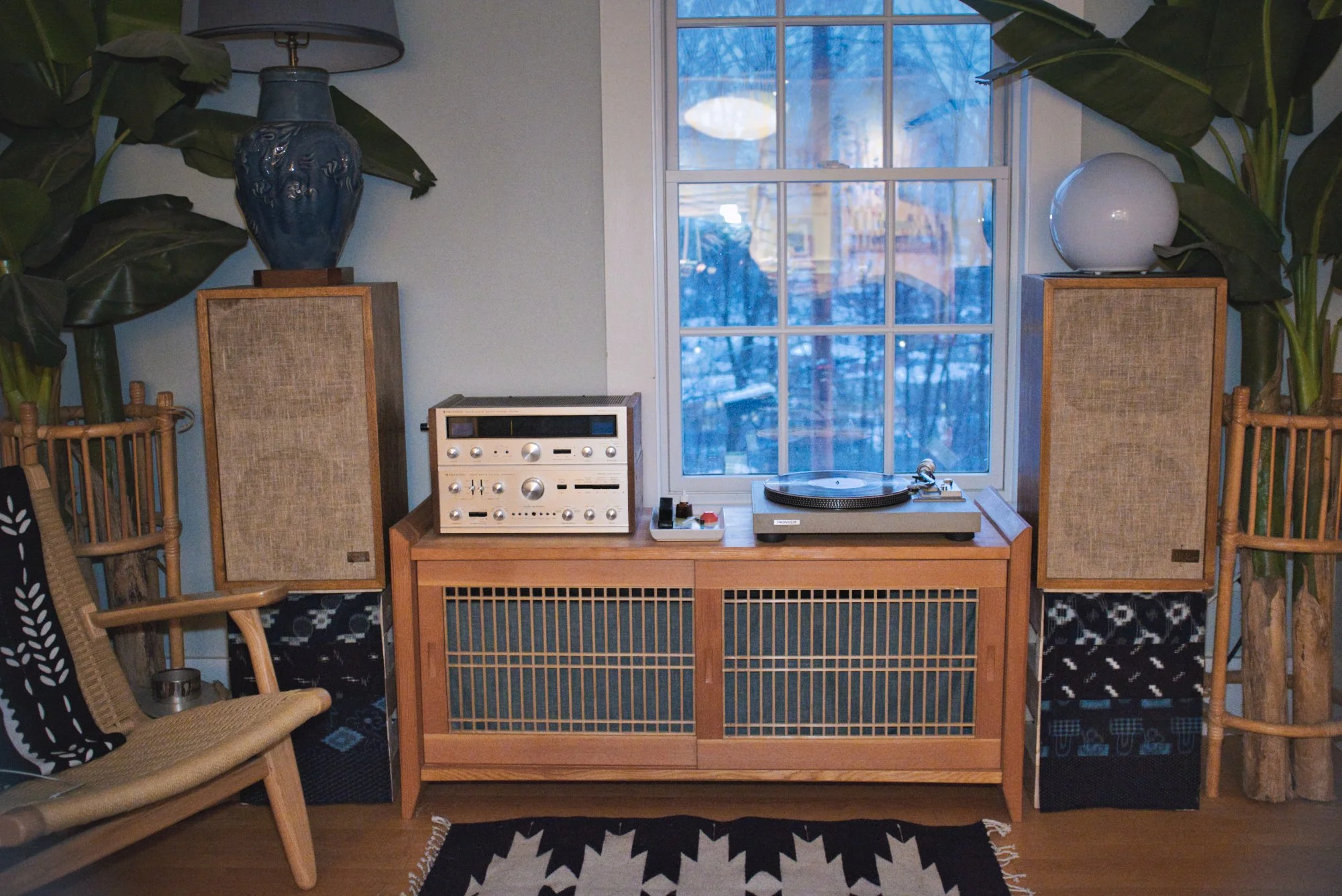 Curly walnut finished in shop made oil/varnish, and wax. Sashiko cloth over the speaker. Retractable leather handle. Asa-no-ha kumiko tucked away beneath the vacuum tubes.